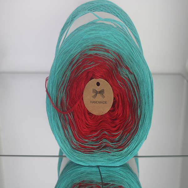 Cette laine 3 – 6 fils- non torsadé – change de couleur à intervalles réguliers. Vous obtiendrez ainsi de magnifiques dégradés et les tout petits nœuds ‘en huit’ (reliant deux fils d’une couleur différente) ne sont pas du tout visibles sur l’ouvrage fini.